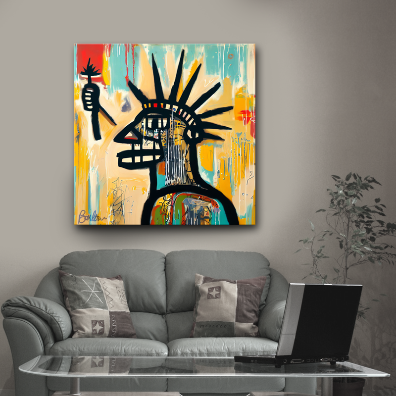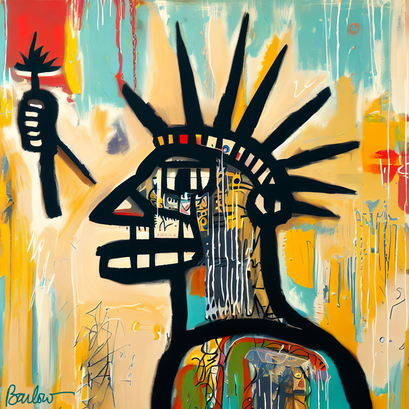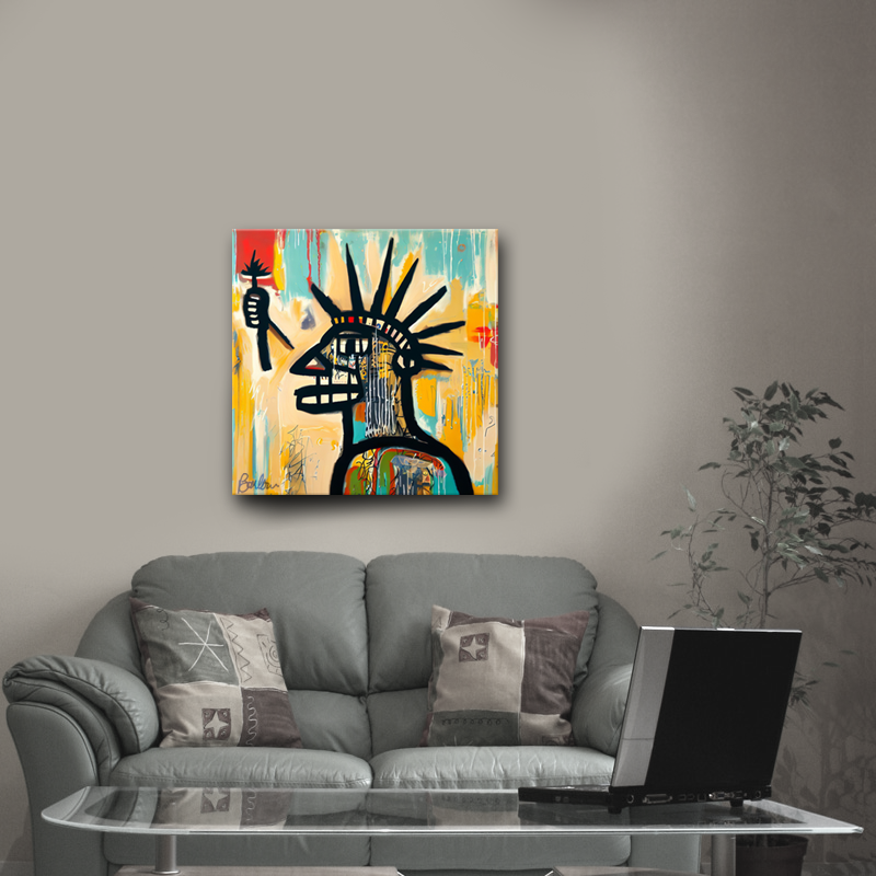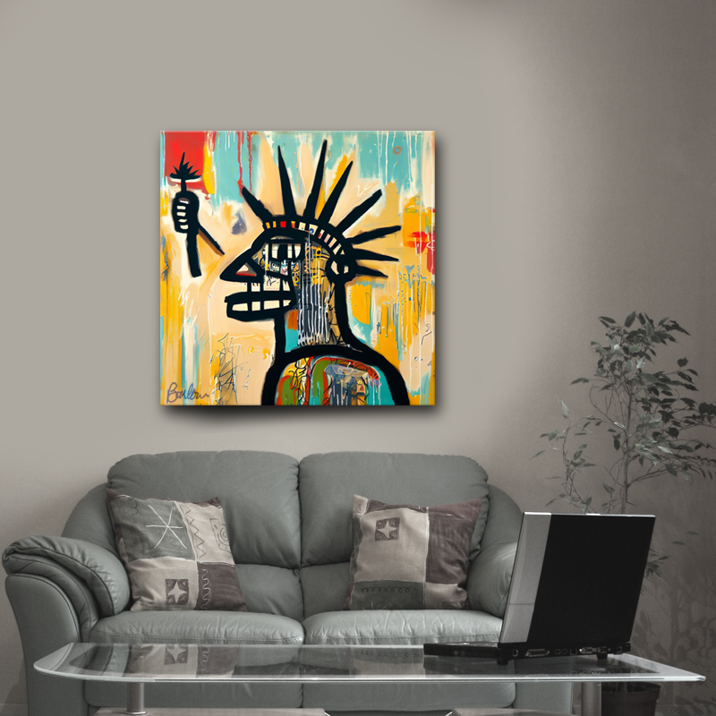 Inspired by Jean-Michel Basquiat this is an imaginative and abstract interpretation of the Statue of Liberty, blending vivid colors and dynamic shapes to evoke a unique sense of American freedom.