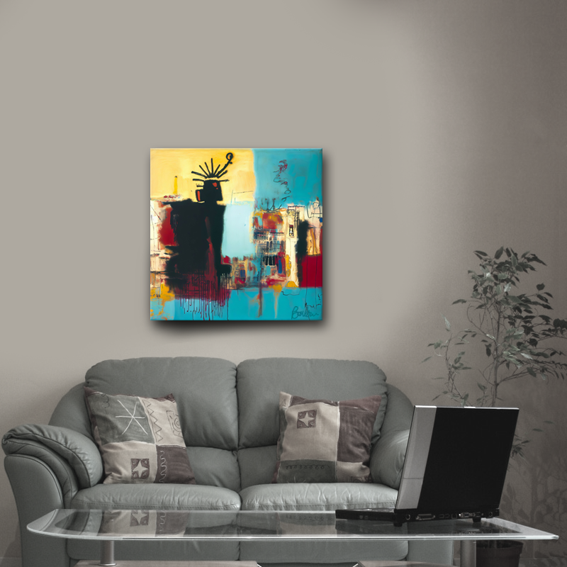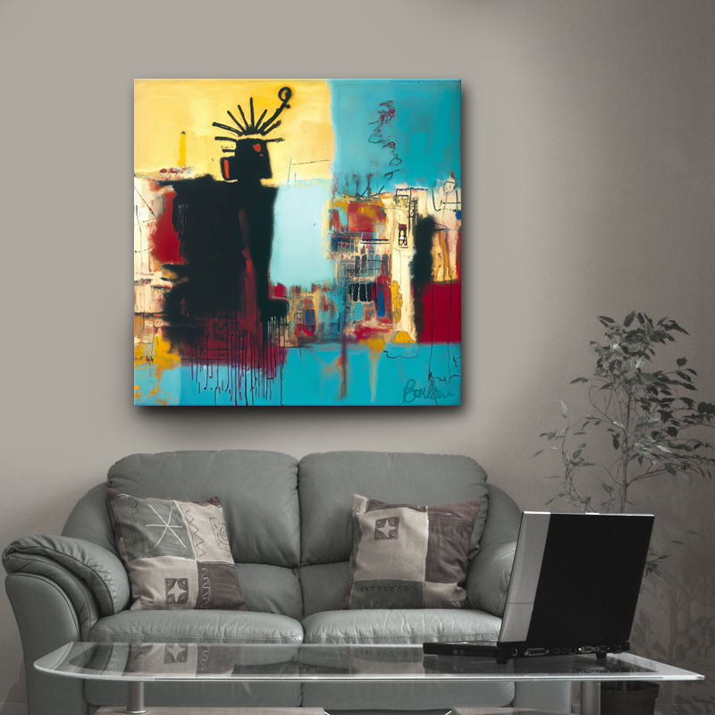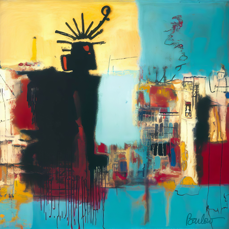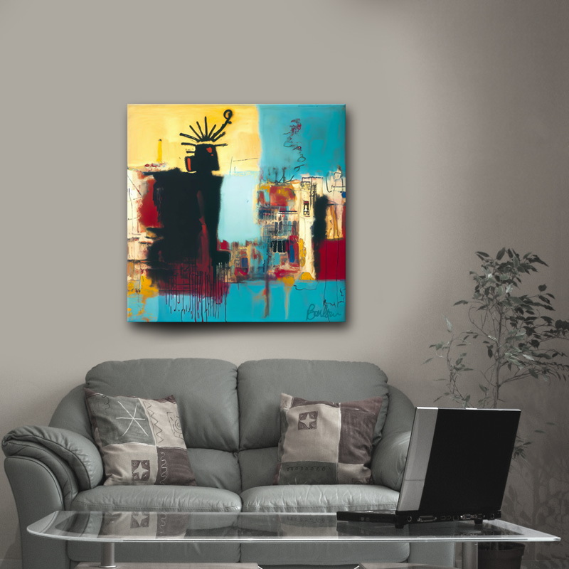 Inspired by Jean-Michel Basquiat this is an imaginative and abstract interpretation of the Statue of Liberty, blending vivid colors and dynamic shapes to evoke a unique sense of American freedom.