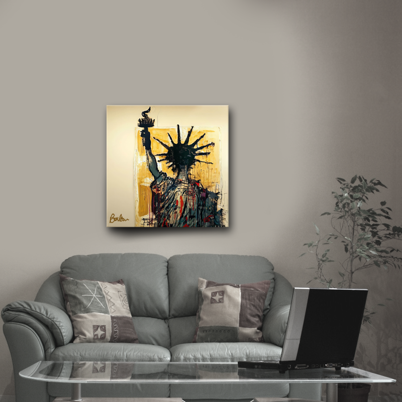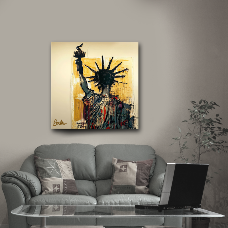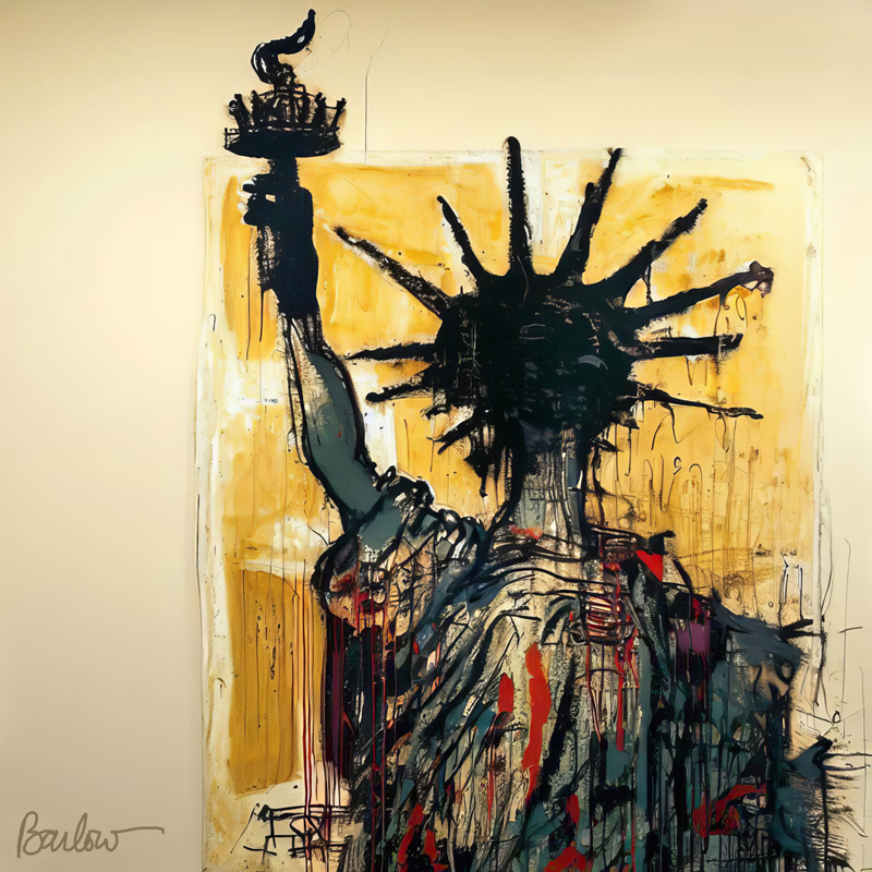 Inspired by Jean-Michel Basquiat this is an imaginative and abstract interpretation of the Statue of Liberty, blending vivid colors and dynamic shapes to evoke a unique sense of American freedom.
